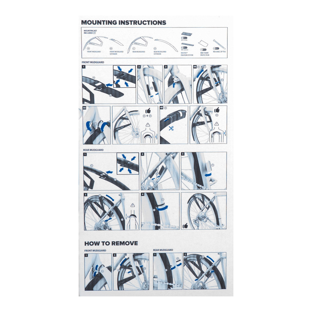 Sada blatníků 28",možnost prodloužení blatníků, přední blatník 220g, zadní blatník 275g, šířka blatníků 50mm, montážní systém bez použití nářadí, součástí balení jsou opakovaně použitelné popruhy, 2 sady Velcro a 2 ochranné fólie pro vzpěru a vidlici. Video k montáži: https://www.youtube.com/watch?v=GHkpWKdwv18