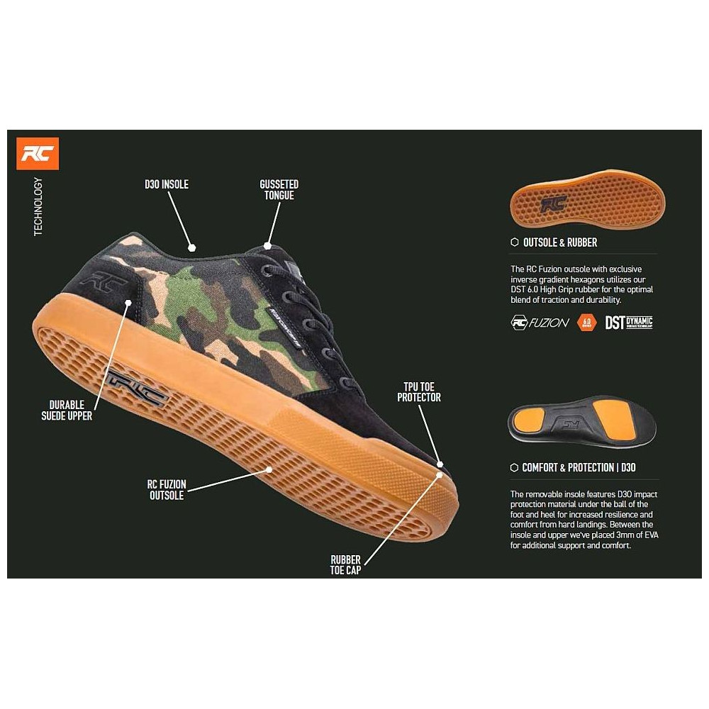 O Ride Concepts - značka je v současnosti největším světovým konkurentem značky Fiveten (nyní Adidas). Má špičkové produkty a rychlý růst po celém světě. Všechny produkty mají výbavu, kterou nemá žádná z konkurenčních bot (například D3O vložky, které chrání nohu a patu před "odražením"). Nabízí maximální kvalitu materiálů a provedení, velký výběr modelů a barevných variant, unikátní technologie a především směsi podrážek plně konkurující 5.10. Směsi podrážek vyvíjí ve spolupráci s kultovní firmou Rubber Kinetics (koncern Good Year). To je zárukou výborných vlastností v oblasti přilnavosti a odolnosti. Špičkové vývojové středisko sídlí v horách Kalifornie, kde mohou ihned vše důkladně otestovat :-). Každý model je vyvíjen na základě dlouholetých zkušeností spolu s nejlepšími závodníky a před uvedením na trh prochází dlouhodobým testováním, na kterém se podílejí takové hvězdy světového bikingu jako Rachel Atherton, Kyle Strait, Sam Pilgrim, bratři Gee a Dan Atherton, či Caroline Buchanan. V průzkumech nákupních preferencí čtenářů serveru Vital MTB 2019, které jsou v oboru velmi vážně brány jako ukazatel vývoje na trhu, je RC v oboru obuvi pro platformové pedály hned na druhém místě a to s několikanásobným náskokem na další známé značky (Shimano, Vans, Giro, Specialized atd.).