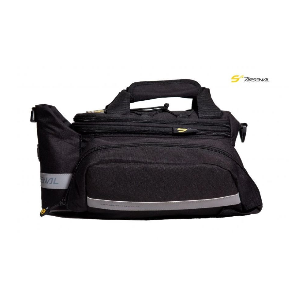 Turistická brašna na zadní, nebo podsedlový nosič, která se vyznačuje svojí objemovou variabilitou a velkým množstvím praktických kapes. Brašna má jednu velkou vnitřní kapsu a dvě postranní vnější kapsy na zip pro praktické rozložení nákladu.