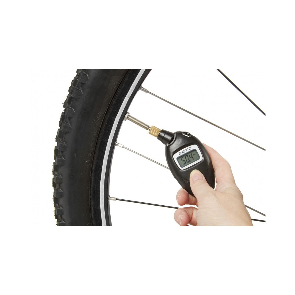Digitální měřič tlaku. Ocení především závodníci u bezdušových systému, kde je častější dofukování a je kladen důraz na přesné hodnoty tlaku v plášti.