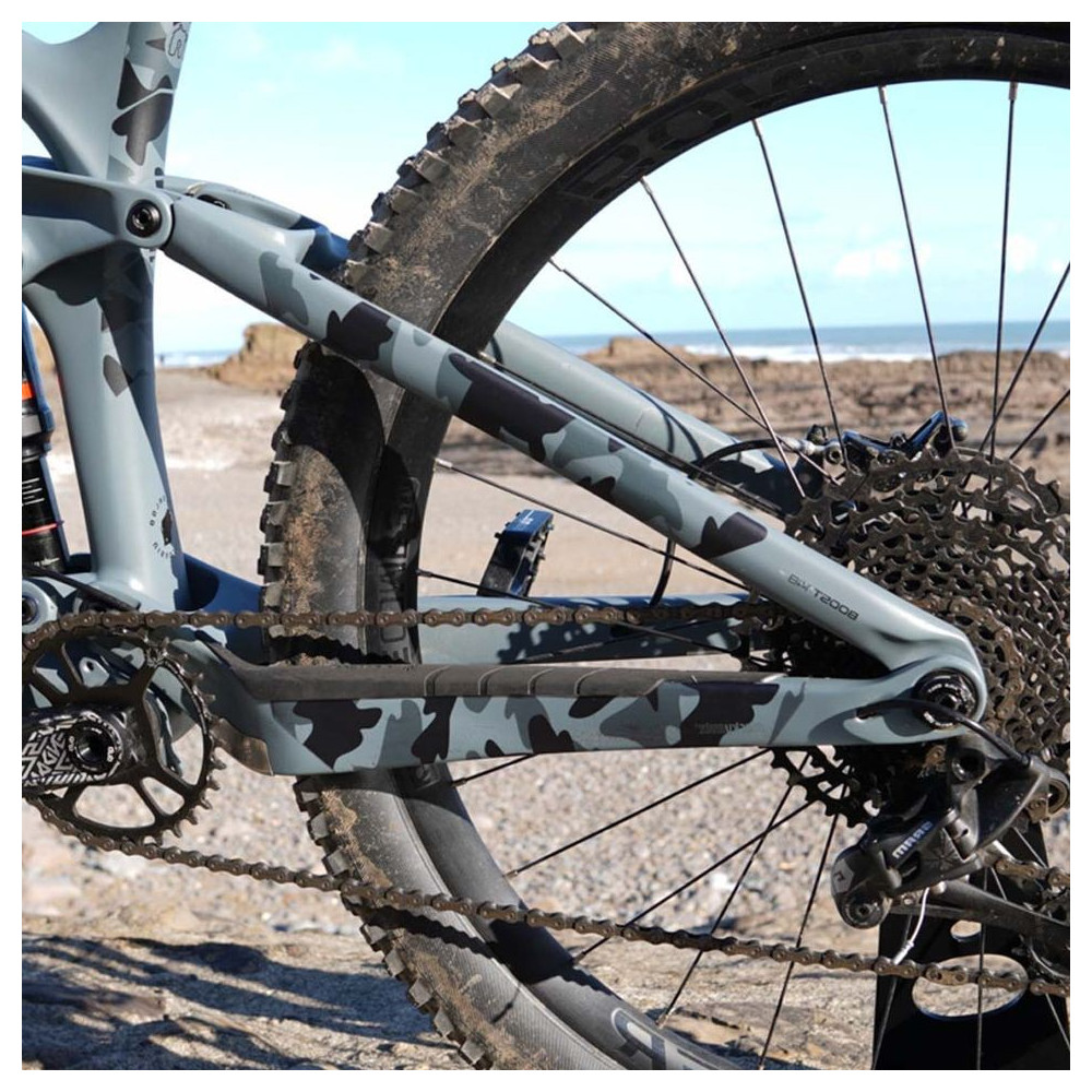 Sada ochranných samolepek pro ochranu rámu v oblasti pohybu řetězu a odvalujícího se zadního kola před poškrábáním - MUCKYNUTZ - Stay Skinz Comouflage