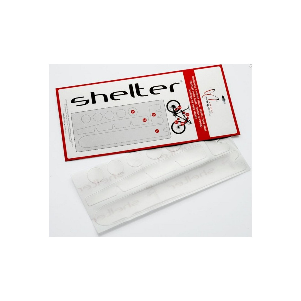 Samolepící ochrana rámů, multivrstvená 50x20 mikronů odolná první vrstva a 200 mikronů vrchní vrstva odolná proti poškrábání. Celková tloušťka 1,2mm. Transparentní, vysoce odolná a elastická směs. Shelter zvyšuje odolnost karbonových nebo hliníkových rámů proti poškození. Balení: sada ochranných samolepek na rám
