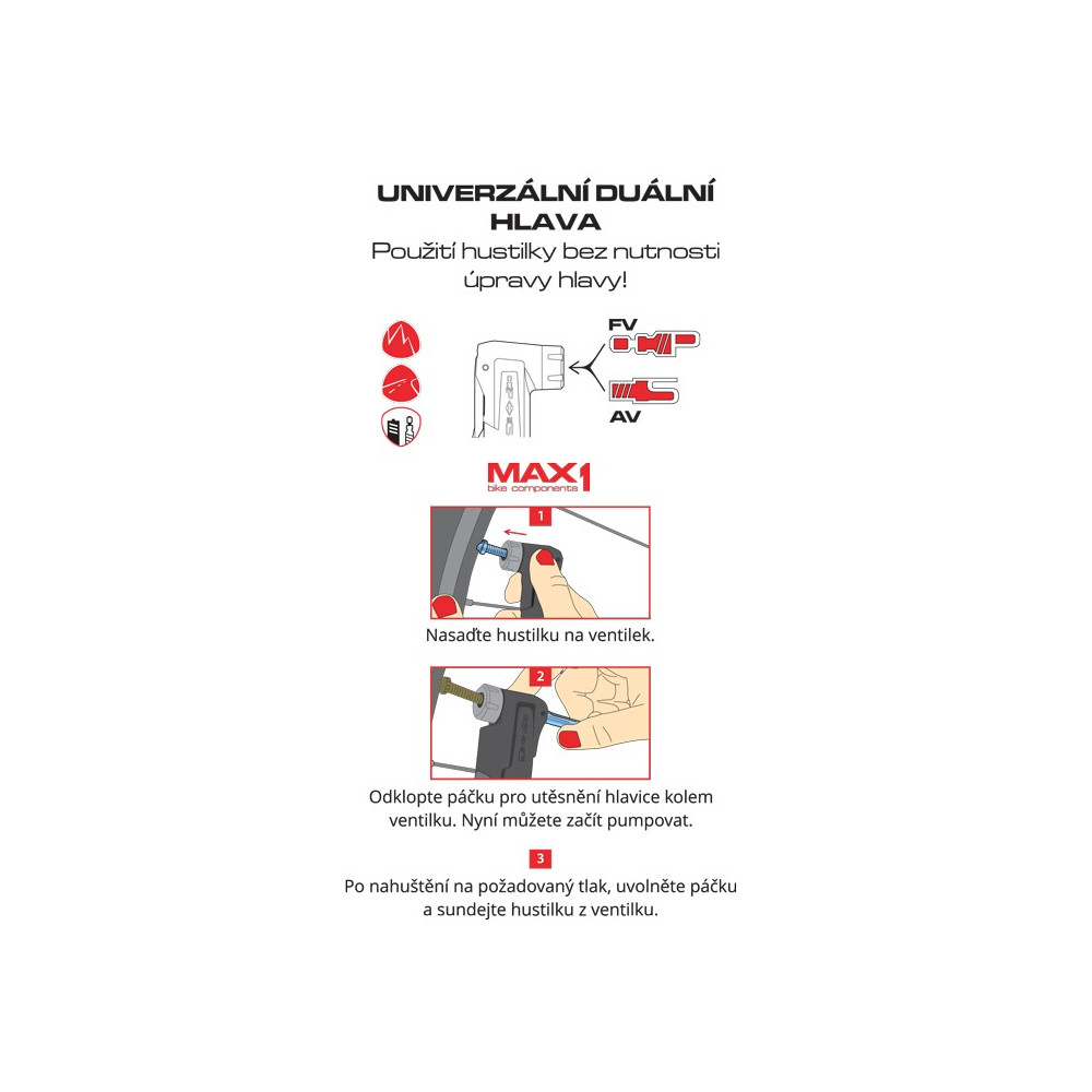Mini hustilka MAX1 Double Valve s univerzální duální hlavou bez nutnosti úpravy hlavy před hustěním. Díky této duální hlavě se hustilka používá velmi snadno a jednoduše.
